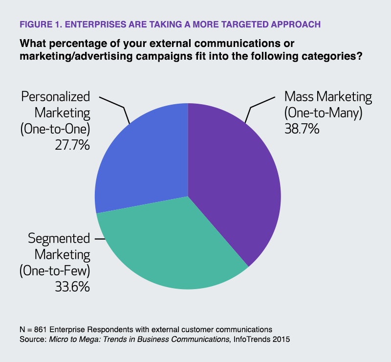 Marketers understand that consumers have come to expect personalization in the marketing messages they receive. They are breaking down mass-market lists into segmented groups linked to purchasing trends, values, and priorities or actual one-to-one communication. The key is that “one size does not fit all,” and the focus has shifted to information that is relevant and specific to the intended recipient. According to InfoTrends’ research, corporate clients report a significantly increased emphasis on customized communications, with more than 60% of campaigns personalized (one-to-one) or segmented (one-to-few).
