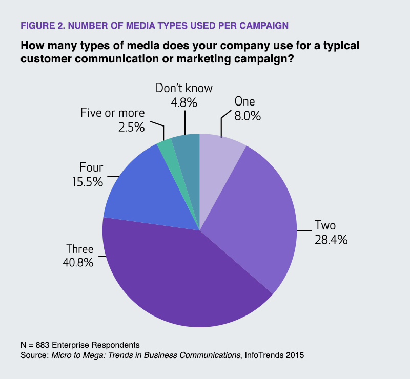 According to Pellow, print will remain a dominant channel. “The big message is that it needs to work well with other channels,” she continues. The term “omni-channel” may be a marketing buzzword, but it refers to a significant shift—today’s marketers must provide a seamless experience, regardless of channel or device. Consumers can now engage with a company in a physical store, on a website or mobile app, through a printed catalog or direct mailer, or through social media. They can access products and services by calling a company on the phone, by using an app on their smartphone, or with a tablet, laptop, or desktop computer. Each component of the consumer’s experience should be consistent and complementary. On average, enterprise respondents report using three different media types for a typical campaign. Meanwhile, 35% of respondents are linking print and digital media and 49% of marketing campaigns have combined print and digital media.